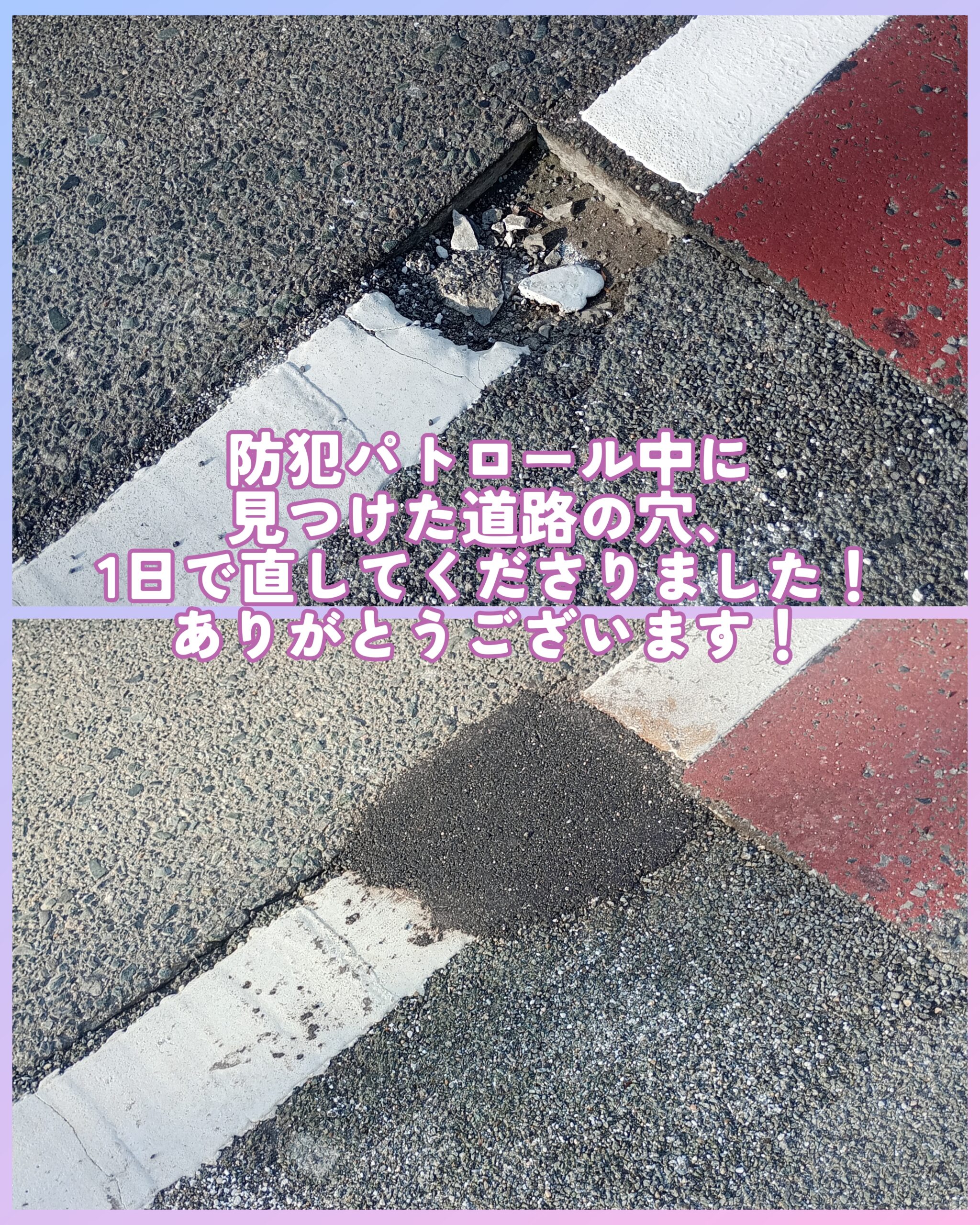 一昨日防犯パトロール中に発見して市役所にお伝えしていた道路の穴(角目公民館前)を確認しに行ったところ、塞いでいただいていました!